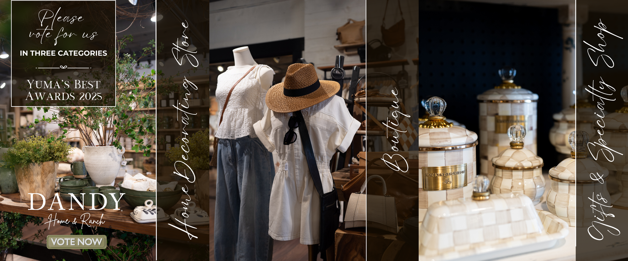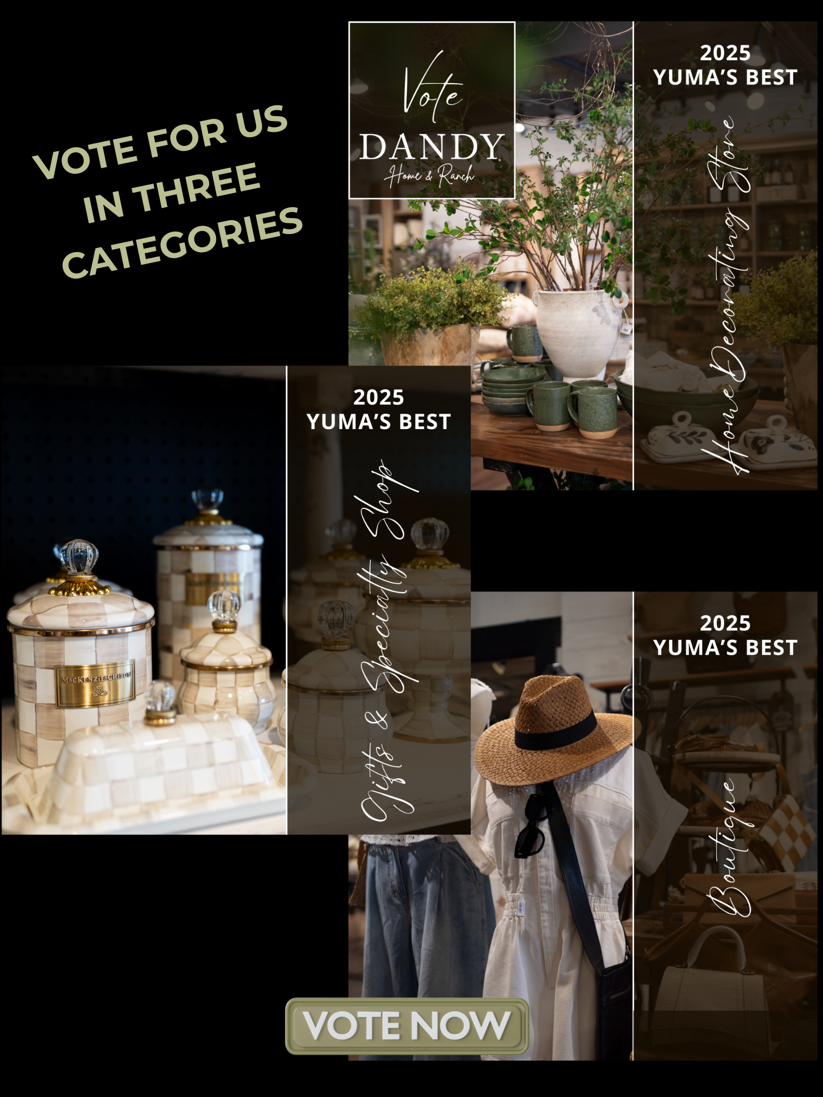 View full detailsOur brick and mortar location is the heart and soul of Dandy and nods to our beloved hometown, Yuma, Arizona: where the rhythm of our community thrives on sunshine, agriculture, and the kindest people you’ll ever meet. Be sure to visit our “Yuma Grown” and “Yuma Love” Collections while you’re here.