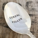 This vintage silver-plated tablespoon is hand-stamped with the playful phrase “Cereal Killer”, adding a fun and unique touch to your kitchen or gift collection.