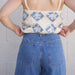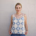 A feminine cami top featuring unique square-pattern crochet fabric. Made from breathable 100% cotton with delicate cotton lace shoulder straps for a soft, detailed look. Fully lined for comfortable coverage.
