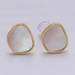 These abstract bezel stud earrings feature luminous shell pearls set in brass with a 14K gold-filled finish. Measuring approximately 11.1mm x 9.6mm x 2.3mm, they are lead-free and nickel-free, making them a comfortable and elegant choice for everyday wear.