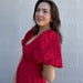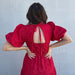 Lightweight jacquard maxi dress featuring a shallow V-neckline with floral detailing, puff sleeves, open back, and a tiered skirt. Perfect for special occasions or styled casually with neutral-toned footwear.