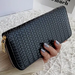 This vegan leather long wallet features a fashionable woven weave pattern and is designed for everyday use. It includes a smooth zipper closure to keep your belongings secure, while the interior is organized to hold cash, cards, and coins. With plenty of storage space, it is both practical and stylish, making it suitable for daily use or travel. The wallet is made from black PU leather and combines durability with a sleek, modern design.
