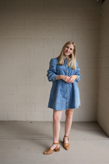 Western-inspired denim mini dress crafted from structured, medium-weight denim with classic topstitching. Features curved yoke seams, antiqued snap...