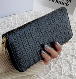 This vegan leather long wallet features a fashionable woven weave pattern and is designed for everyday use. It includes a smooth zipper closure to ...