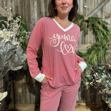 Red and cream striped pajama set featuring a soft cream base adorned with our custom Yum Love signature print — cozy, classic, and designed for eff...