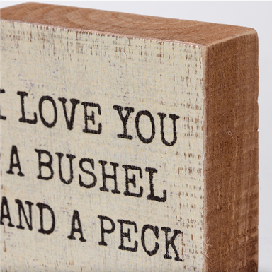 A wooden block sign featuring "I Love You A Bushel And A Peck" sentiment. Design is replicated from original artwork painted onto burlap canvas, gi...