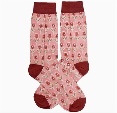 A pair of colorful socks displaying a red floral pattern recreated from an original hand painted design that pairs well with gifts from our Mother...