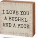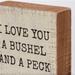 A wooden block sign featuring "I Love You A Bushel And A Peck" sentiment. Design is replicated from original artwork painted onto burlap canvas, giving the art a unique depth and texture. Natural wood sides make the design pop. Wooden wall art is easy to hang via predrilled keyhole slot or can free-stand alone.