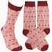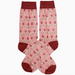 A pair of colorful socks displaying a red floral pattern recreated from an original hand painted design that pairs well with gifts from our Mother's Day Collection. Socks feature a one size fits most design made with cotton, nylon, and spandex.