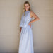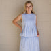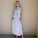 This two-piece matching set features a sleeveless top paired with a coordinating midi skirt for an effortlessly polished look. Designed with delicate pintuck detailing and flared yoke gathering, it creates soft texture and movement while maintaining a relaxed, feminine silhouette—perfect for casual outings, warm-weather events, or everyday styling. Model is wearing a small.