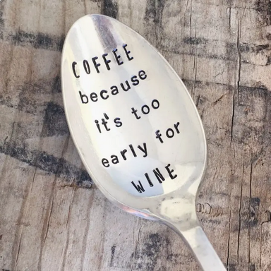 Each vintage silver-plated spoon is hand-stamped with playful coffee and cocktail phrases. Handle patterns vary, making every spoon unique.
