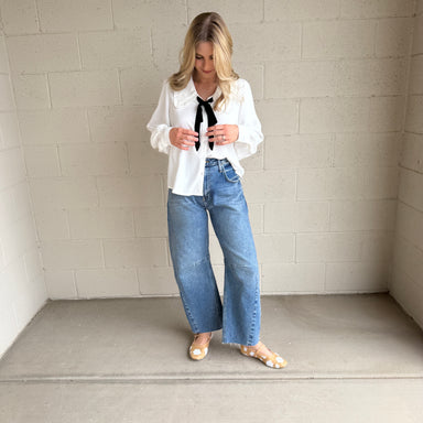This charming blouse features a Peter Pan collar with a bow tie. It pairs effortlessly with your favorite skirt or pants and looks great with heels...