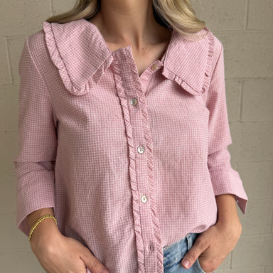The Checked Ruffle Edge Collar Buttondown Blouse blends timeless plaid patterns with a feminine touch. The ruffle edge collar adds a delicate and s...