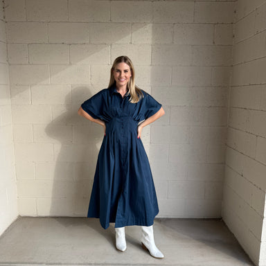 This navy button-down maxi dress offers a refined take on a classic silhouette. Tailored in a durable yet breathable blend of polyester and cotton,...