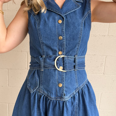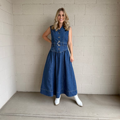 Soft washed denim dress crafted from midweight cotton denim with a fluid, comfortable drape. Designed with a structured sleeveless bodice featuring...