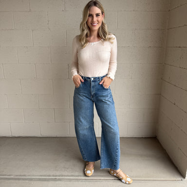 This round-neck long sleeve bodysuit in cream/blush features a delicate bow detail, combining elegance with everyday comfort. Its sleek silhouette ...