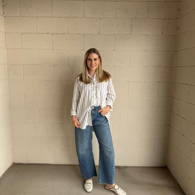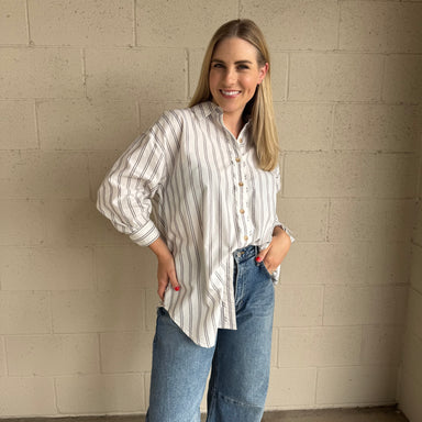 Relaxed, oversized woven shirt in an ivory stripe pattern. Features a pointed collar and long sleeves for a timeless look. Made from 100% cotton, i...