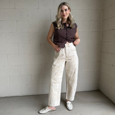 A soft neutral palette meets intricate floral embroidery in these barrel-leg pants. Designed with a relaxed fit and gently curved silhouette, tonal...