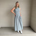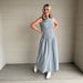 Sleeveless long dress with a mini gingham pattern in blue. Crafted from a polyester-rayon blend with added stretch for comfort and ease of wear. Model is wearing a size Small.