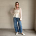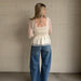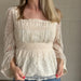 Lightweight textured woven blouse with delicate lace detailing throughout. Features a flattering square neckline, billowy long sleeves with elastic cuffs, a smocked back for comfort, and a softly flared peplum hem. Fully lined bodice for coverage. Romantic and versatile—easy to dress up or down.
