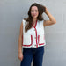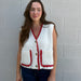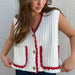 Add a playful twist to your collection with this soft knit vest featuring bold red scallop contrast trim. The ribbed texture and structured patch pockets add charm and dimension, while the relaxed fit makes it perfect for layering over a tee or blouse.