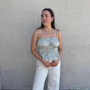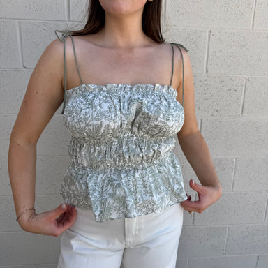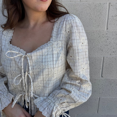 This beige floral embroidered tie top features intricate floral embroidery with a soft tonal contrast. Designed in a relaxed, cropped silhouette, i...