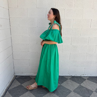 Lightweight jacquard maxi dress featuring a shallow V-neckline with floral detailing, puff sleeves, open back, and a tiered skirt. Perfect for spec...