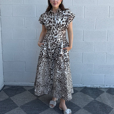 Printed woven midi dress in taupe brown, featuring a contemporary silhouette with a lightweight feel and effortless drape. Allover printed patter...