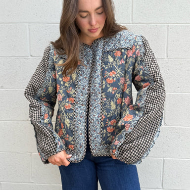 This mixed print quilted jacket features a round neckline, open front, and contrast gingham binding along the edges. Designed with long puff sleeve...