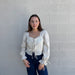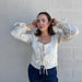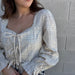 This beige floral embroidered tie top features intricate floral embroidery with a soft tonal contrast. Designed in a relaxed, cropped silhouette, it includes a vintage-inspired square neckline and a front self-tie closure with three delicate bows for adjustable styling. Made from lightweight, crinkle-textured 100% cotton, it also features long puffed sleeves with adjustable drawstring cuffs.