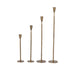 This set includes four hand-forged cast iron taper holders in sizes 3" × 11¾", 3" × 15½", 4" × 19½", and 4" × 23½". Finished in elegant brass, each holder features a bead design, adding a rustic yet refined touch to any table or mantel.