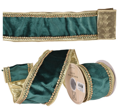 This elegant ribbon features rich emerald green velvet with a gold lamé backing and a wired edge trimmed in gold and faux gemstones—a perfect accen...