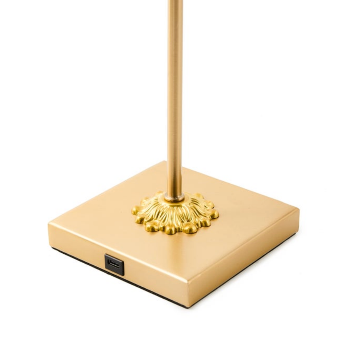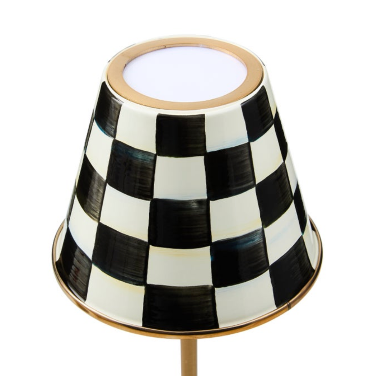 The Courtly Check® LED Rechargeable Cafe Table Lamp is the little light that shines big without the inconvenience of cords. Featuring our signature pattern on a brass-finish base, it illuminates for up to three hours and recharges with a 5-watt USB cable (included). It operates with ease by tapping the shade on the top, and there are three settings for brightness.