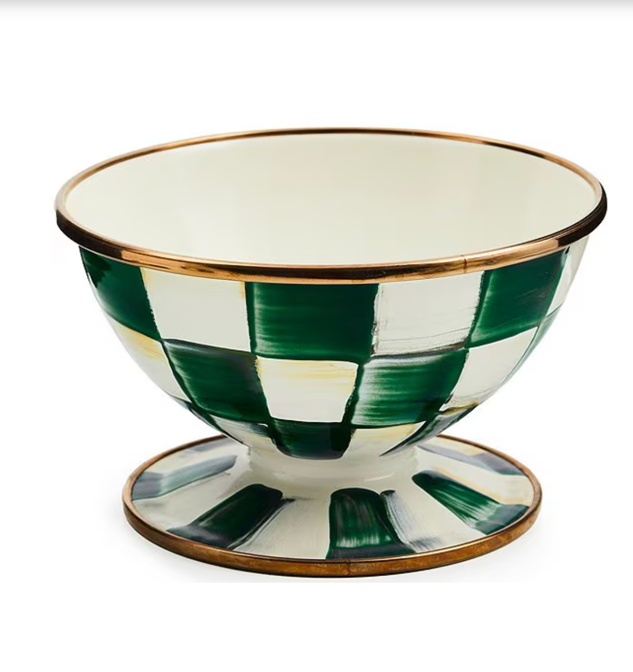 Scoop up signature style with our Emerald Check Ice Cream Dish. The deep bowl and pretty pedestal are decked in our hand-painted green checks and rimmed in bronzed stainless steel.
