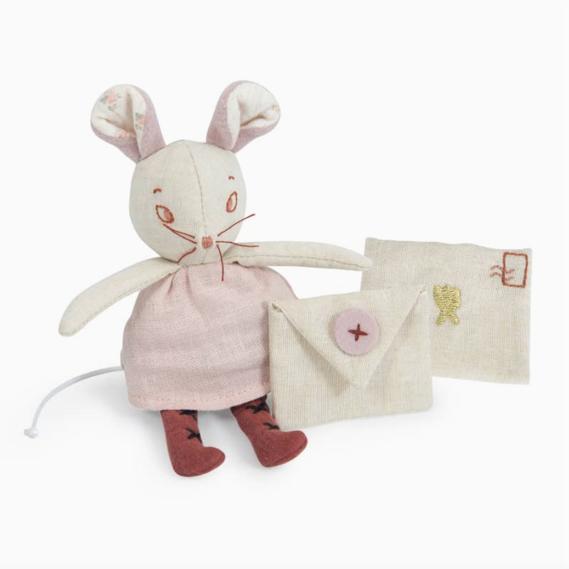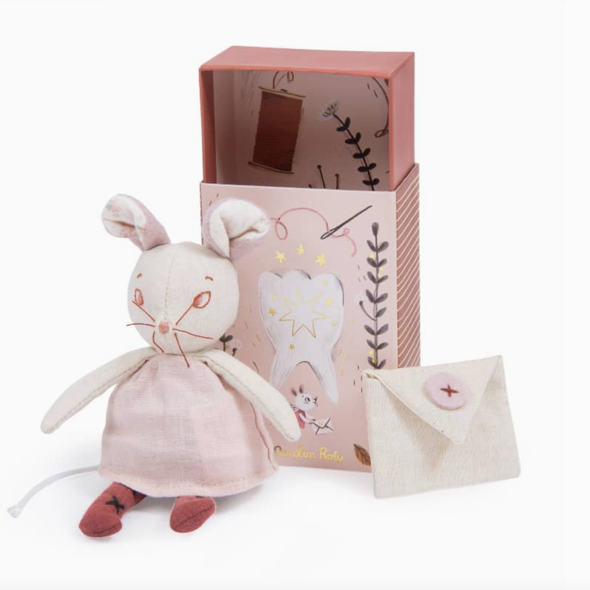 Introducing the Tooth Fairy Mouse from the After the Rain collection! This adorable stuffed toy comes with an envelope adorned with a lovely floral design, perfect for storing your baby's precious teeth. With a delicate embroidered face, super soft velvet ears, and a linen dress with wings at the back, she is sure to enchant children and adults alike. Plus, it comes in a beautifully illustrated gift box, making it the perfect gift.