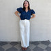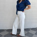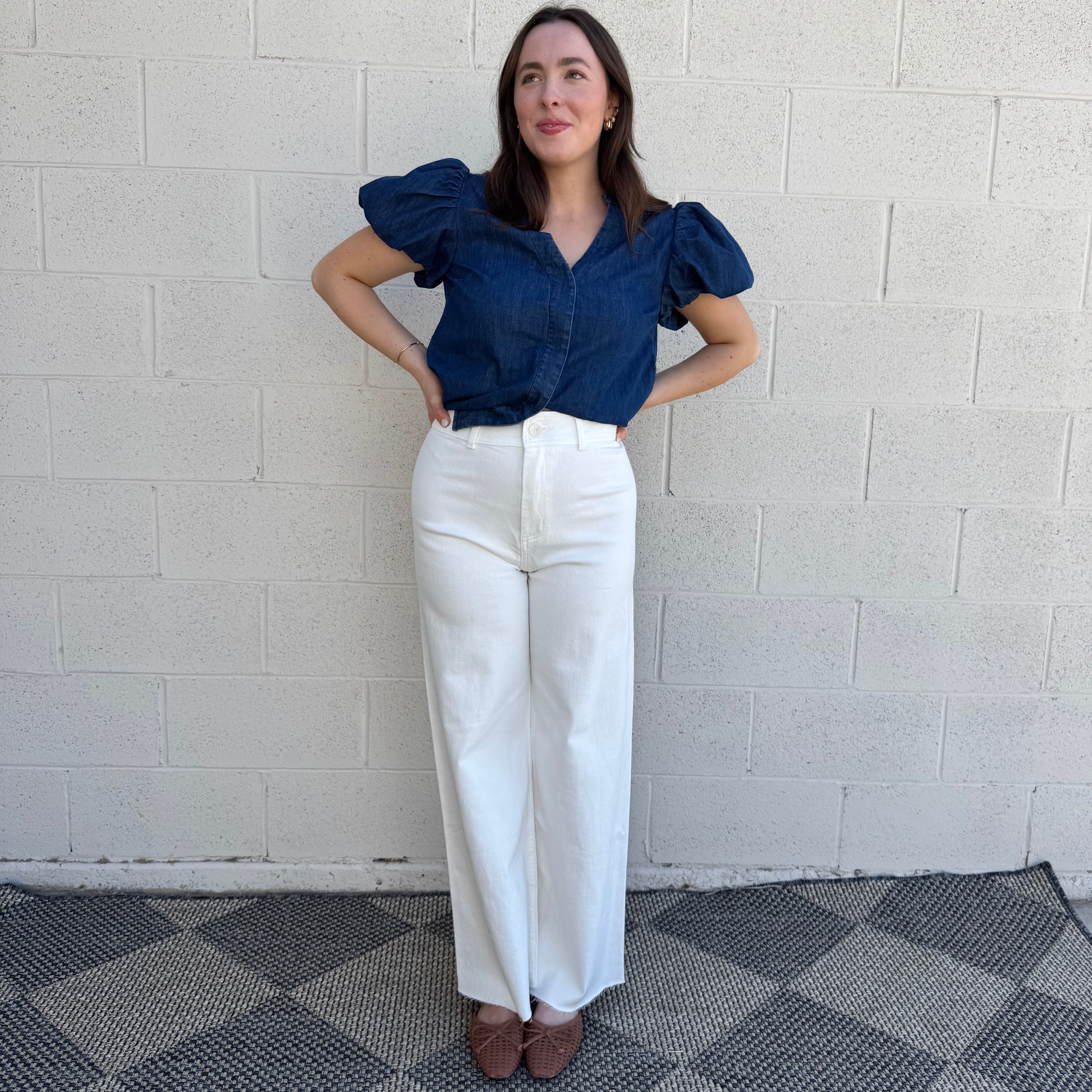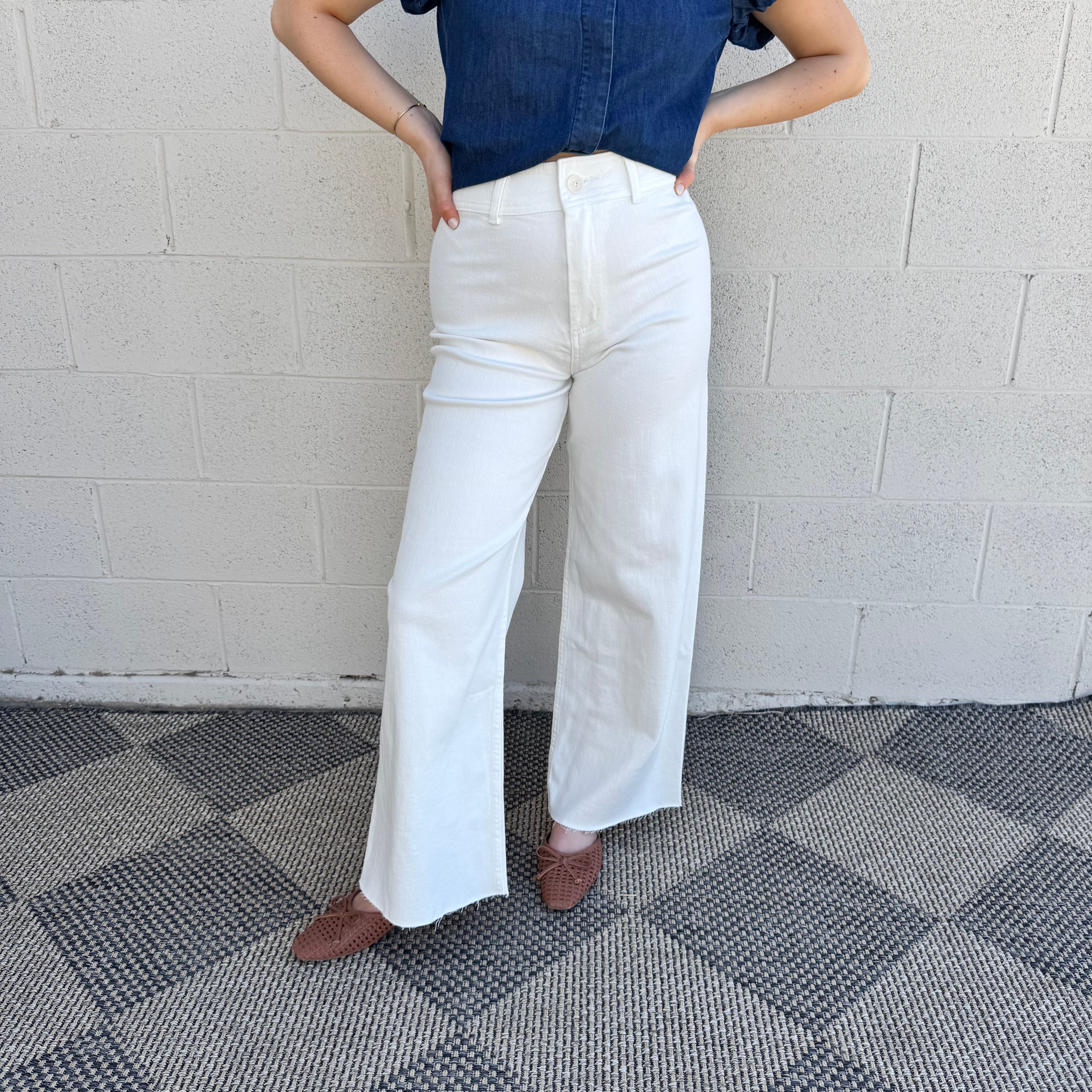 These cream denim wide-leg jeans offer a flattering silhouette with a sleek, no-pocket front, raw hem, and large back pockets. They’re unique yet simple, with just the right amount of stretch for all-day comfort. Made from 98% cotton and 2% spandex. Hannah is 5’3” and wearing a size medium.
